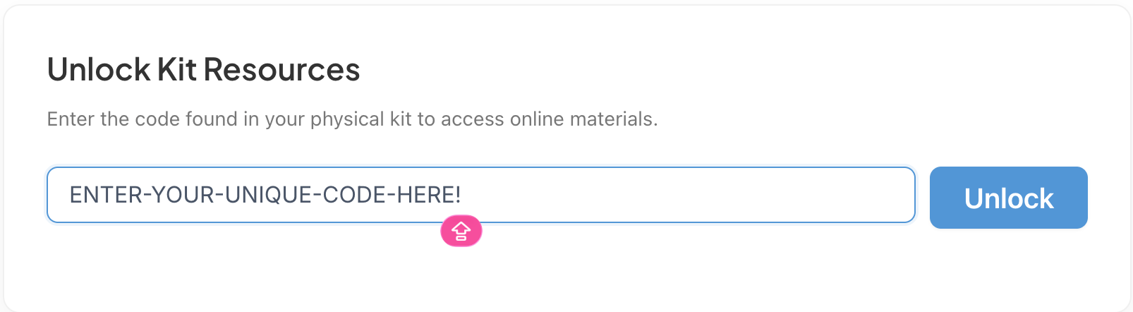 After completing the first step, you'll be directed to our 'Unlock Kit Resources' page. This is where you'll enter your unique customer portal code. Again, you can find this code on the sticker, which is located on the inside cover of your Instructor Guide.