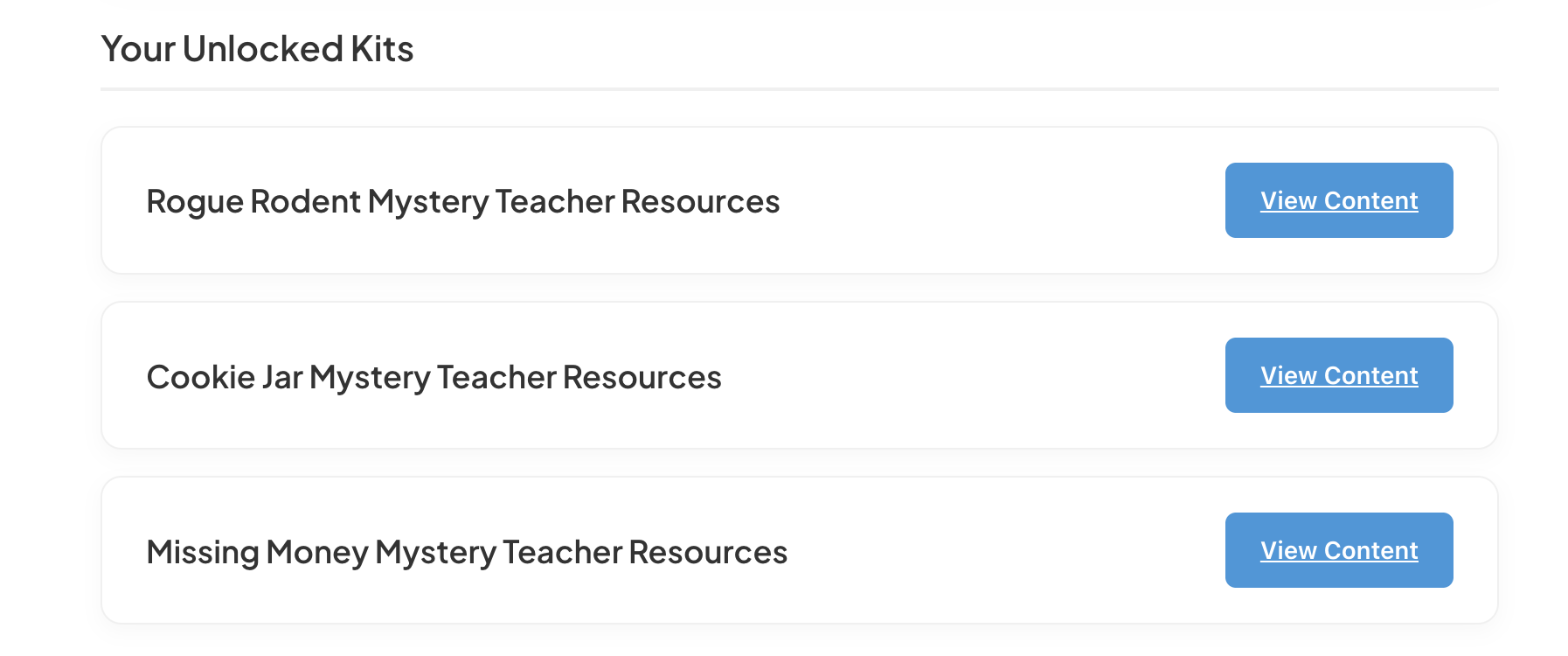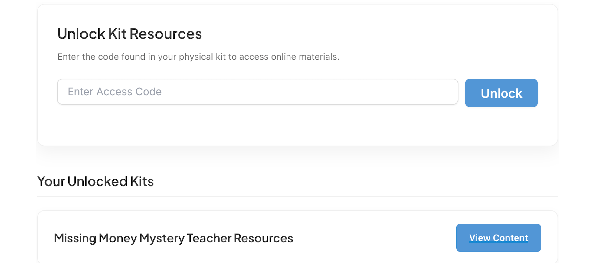 Once you've successfully entered your unique code, your unlocked kits will appear at the bottom. For example, if you purchased the Missing Money Mystery, the unlocked kit content will say Missing Money Mystery Teacher Resources. From there, simply click "View Content" on the right-hand side. This will lead you right to all of our resources for that specific mystery.