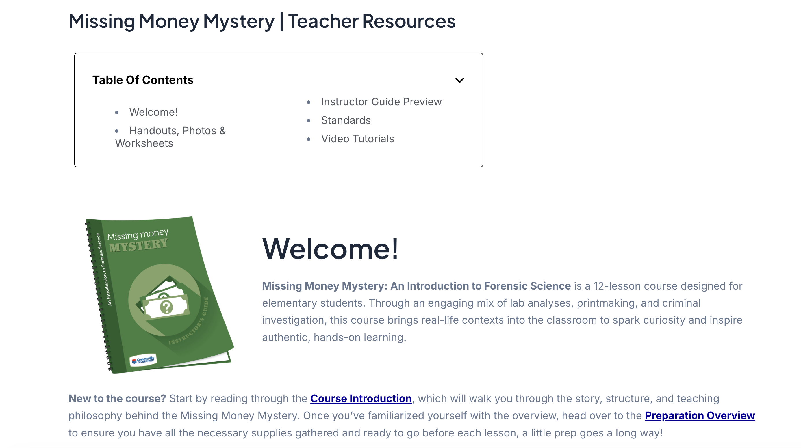After clicking 'View Content' for your unlocked kit, you'll be taken to the home page of your purchased mystery. Each mystery's home page follows a similar layout and style. Here's an example of what the Missing Money Mystery home page looks like: