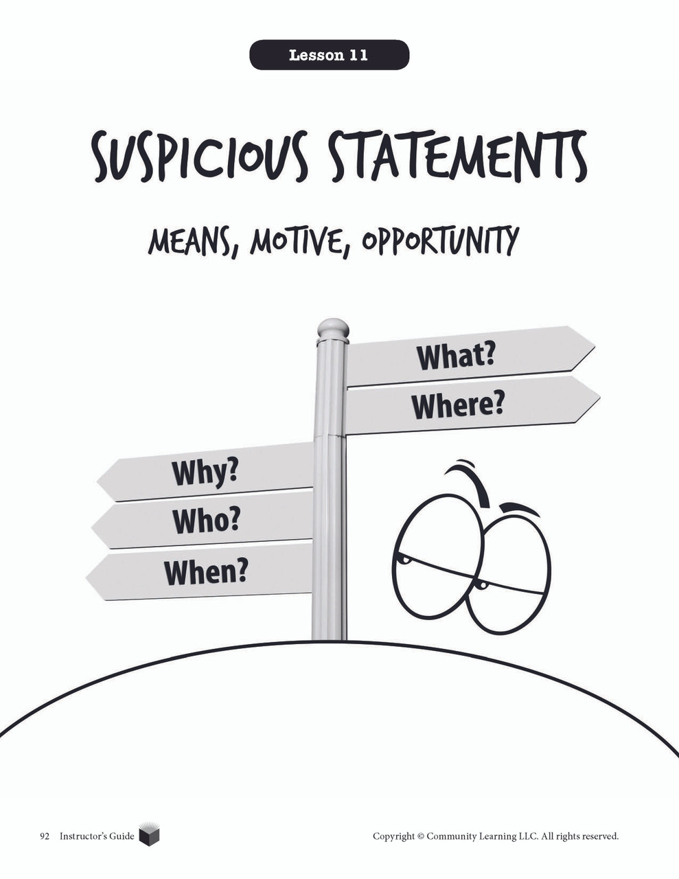 Lesson 11: Suspicious Statements: Means, Motive and Opportunity: Students take a careful look at the letters each suspect wrote in the beginning of the year to see any possible connections between their interests and the classroom crime.