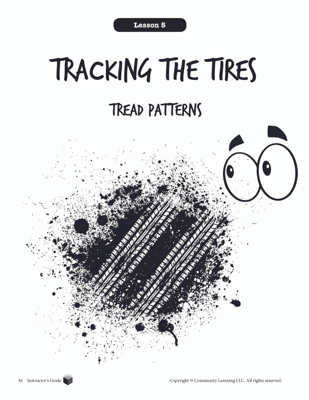 Lesson 5: Tracking the Tires - Tread Patterns: The plot thickens as Mr. Muggs asks his students to examine the strange pattern of tire tread evidence discovered outside his window. Can you figure out who rode the getaway bicycle?