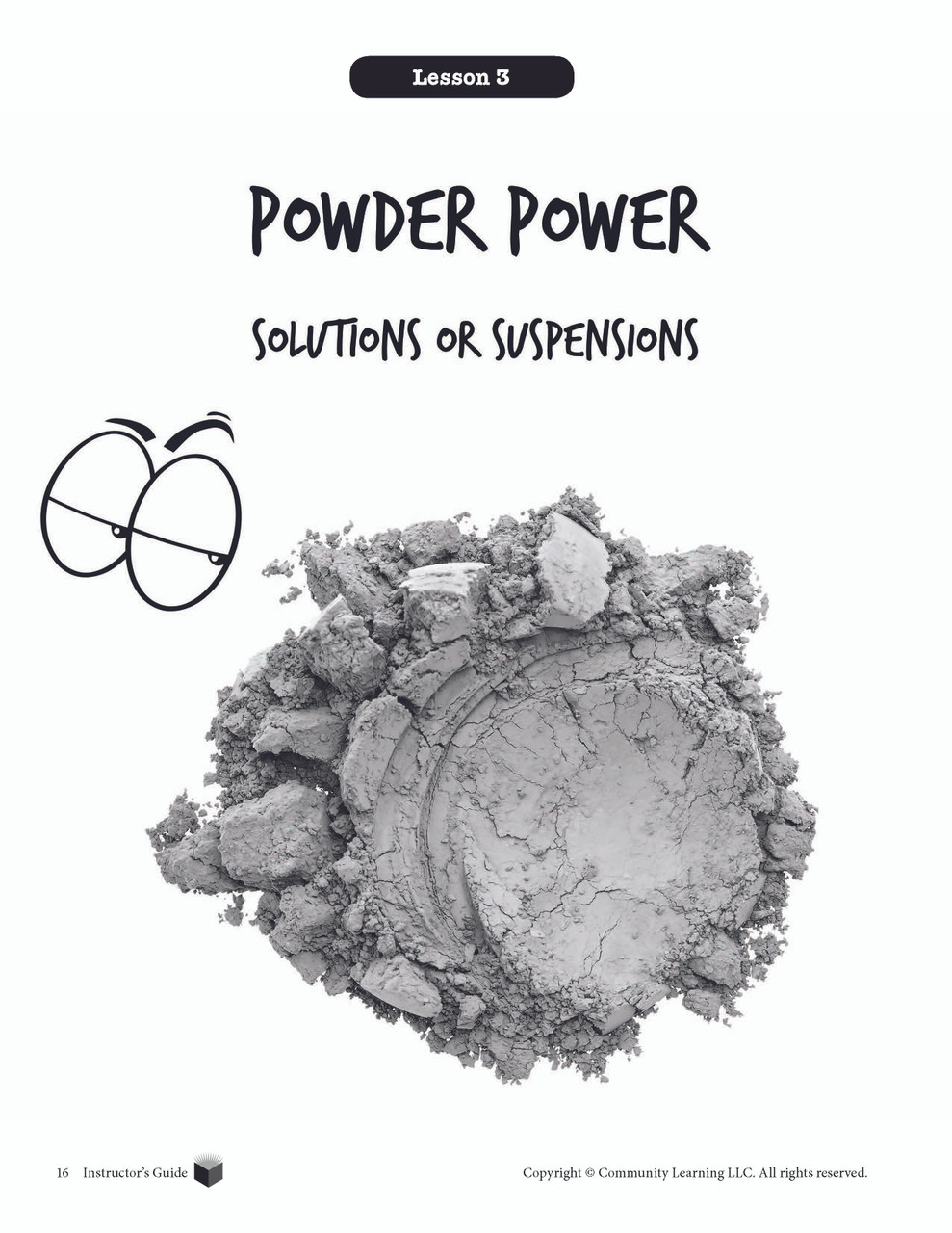 Lesson 3: Powder Power - Solutions or Suspensions? Don’t let our sneaky cash-snatcher getaway! The plot thickens (and so do some solutions—or are they suspensions?) as students experiment with different mysterious white powders.