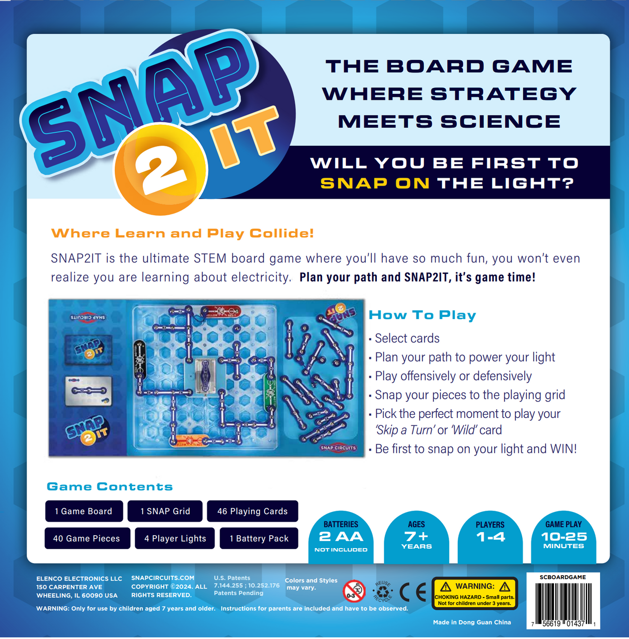 Race against 1-3 opponents to be the first to power up your light by building a complete circuit path with real SNAP CIRCUITS® parts! Connect your light to the shared battery pack by strategically snapping components together—first to illuminate wins.
